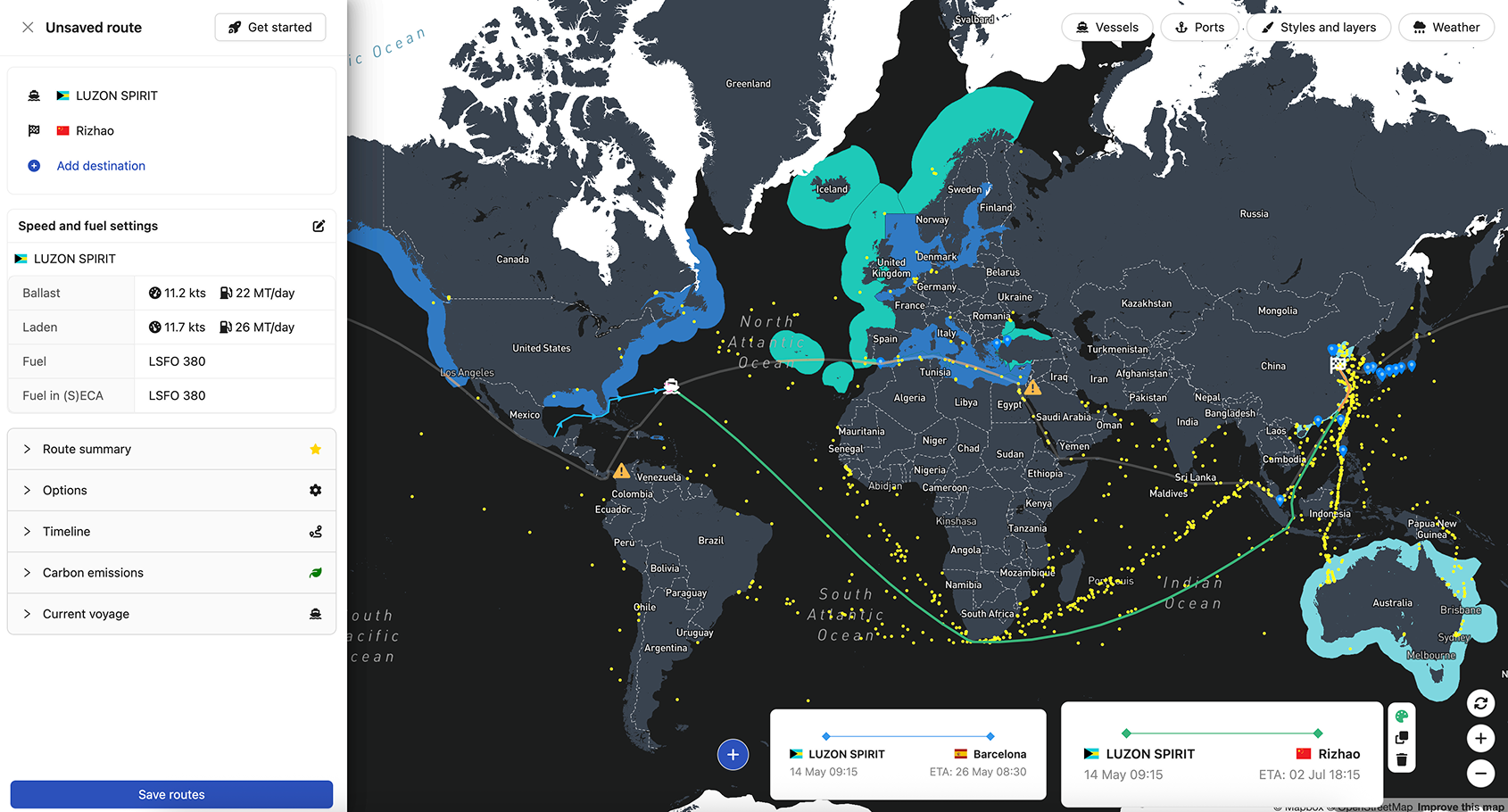 Find the shortest sea routes and compare alternative routes. Get distances, ETAs, calculated carbon emissions (EU ETS) and bunker consumption.