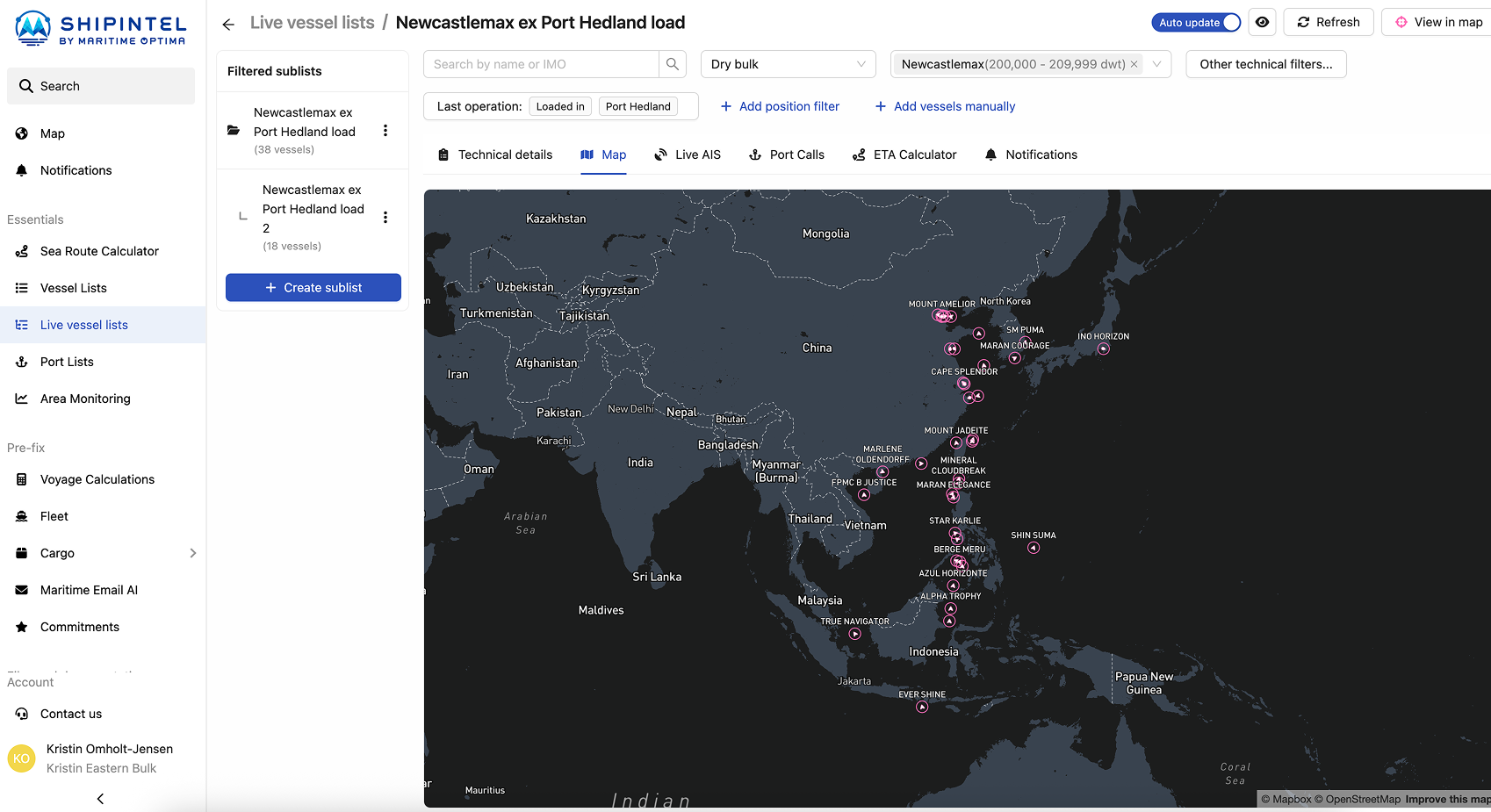 Create live vessel lists based on criteria such as; ballast/laden, current position, speed, course etc. and be notified about changes in real-time.