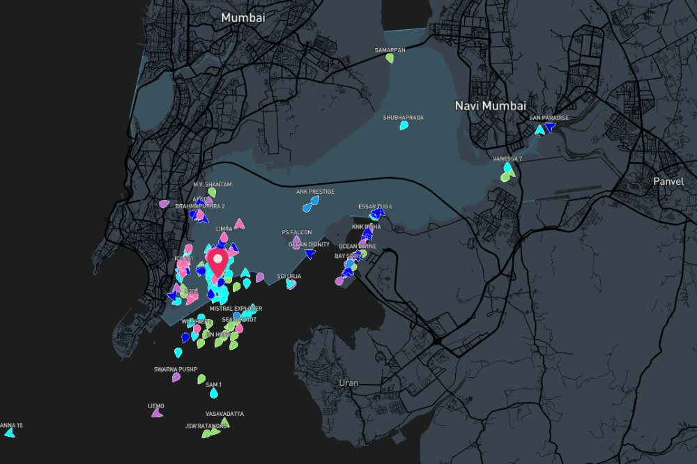 Below you can see an example of the vessel traffic in Mumbai port. The screenshot is taken on August 29th.
