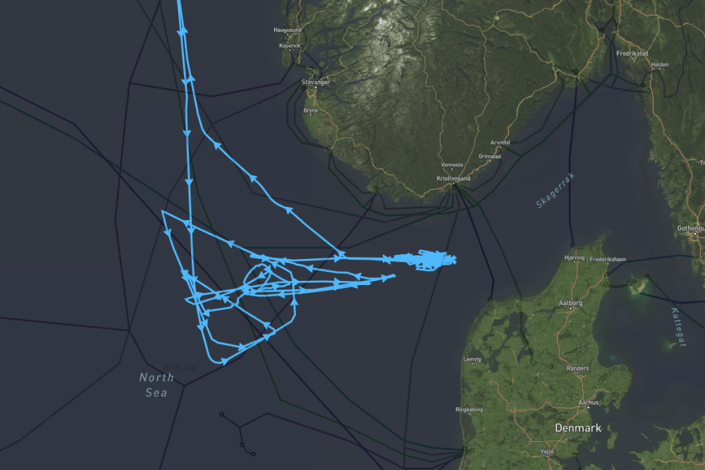 Mulan sailed in a zigzag pattern in the North Sea for over a week / Screenshot: Submarine Cable Map by TeleGeography & ShipIntel by Maritime Optima / Graphic: Line Omholt-Jensen.
