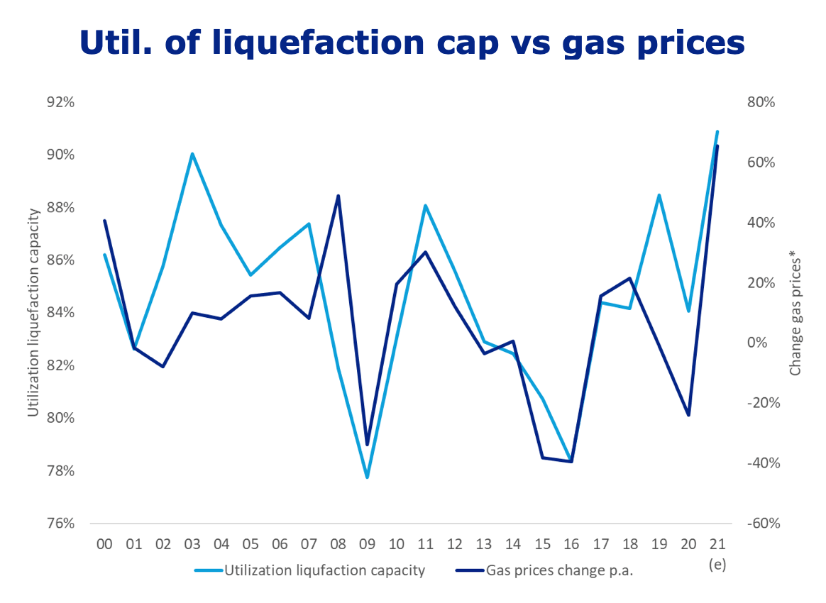 The causation for tighter LNG shipping runs along the following lines: The market expectations for 2021 was rather muted as the LNG fleet was expected to expand quite considerably. At the same time liquefaction capacity coming on stream in 2021 is at a cyclical low. Additions to liquefaction capacity is vital to demand and explains as much as 61% of the variations in volumes shipped in any given year. So, with a scenario where supply (LNG fleet growth) would probably outpace demand, market expectations were muted. However, gas prices are an important factor in the dynamics of LNG carrier demand. We observe that utilization of LNG liquefaction capacity is closely linked to gas prices, which is probably a fair assumption as gas producers will likely try to profit from better prices and increase production if possible. Including utilization of LNG liquefaction capacity in the model for volumes shipped improves explaining volumes shipped significantly. Further, we also observe that average distances travelled by the LNG vessels fluctuates with gas prices. Probably, gas is sourced first from the closest sources and then further away if need to be. Shipping is after all also a cost to the consumer.