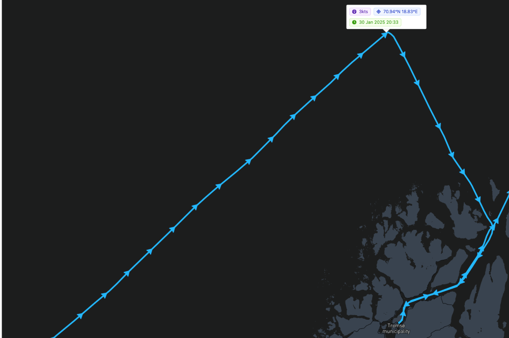 AIS tracking from Maritime Optima shows that the vessel stopped in waters on Thursday evening before heading to Tromsø.