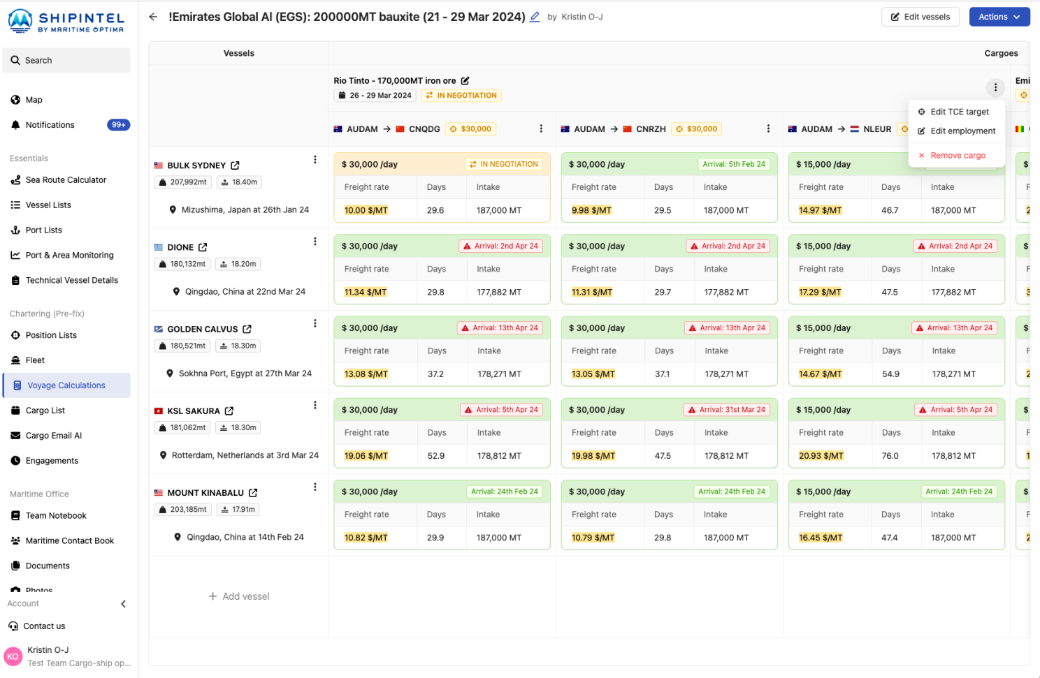 Pre-voyage calculation, is an essential decision-making tool for chartering managers, shipowners, and operators, to find the optimal combination of a portfolio of cargoes and vessels. In ShipIntel you can calculate and find which cargoes and vessels gives you the highest TCE; by changing the freight rates or set a TCE for the portfolio, and then get the freight rate.